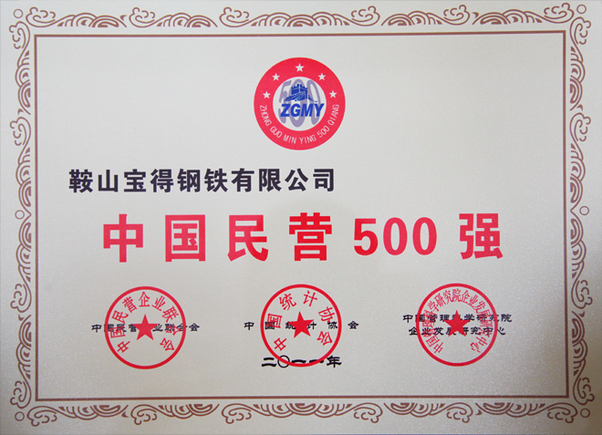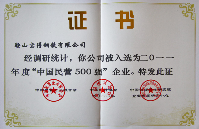 公司榮獲2011中國民營經濟500強,排名第391位。遼寧省共12家企業(yè)入選。